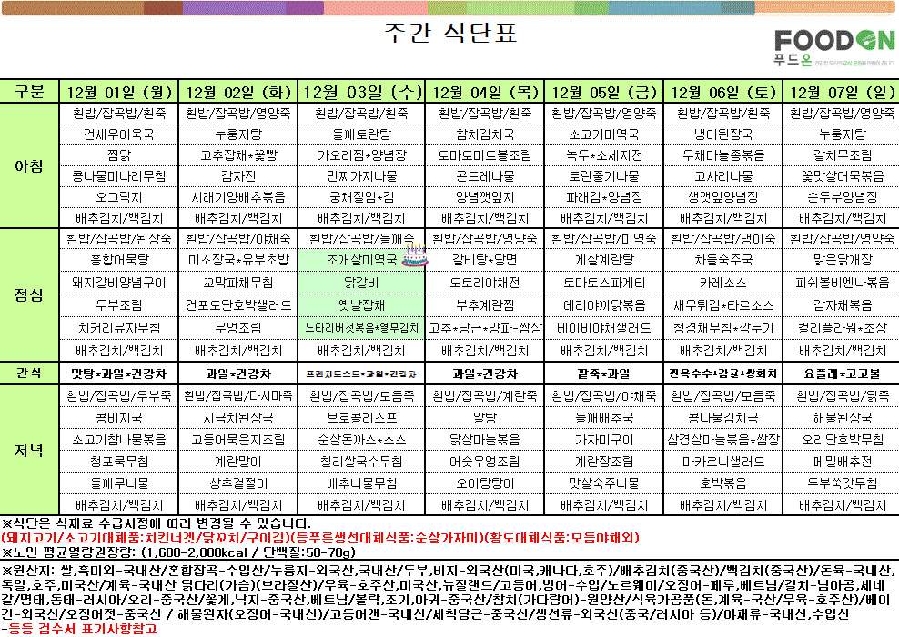주간식단표(25.12.1.~12.7.) 작성일 25-12-01 09:43 본문 . 목록 이전글주간식단표(25.12.8.~12.14.) 25.12.08 다음글주간식단표(25.11.24.~11.30.) 25.11.24