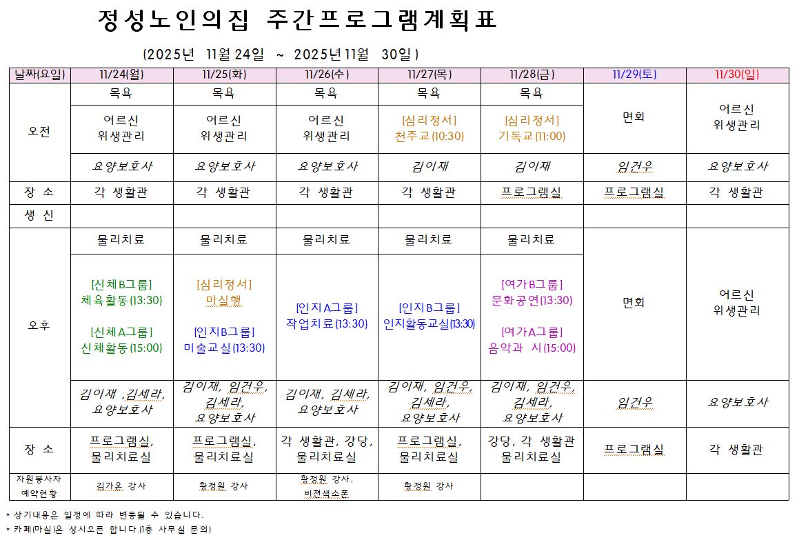 주간프로그램계획표(25.11.24.~11.30.) 작성일 25-11-21 17:34 본문 . 목록 이전글주간프로그램계획표(25.12.1.~12.7.) 25.11.28 다음글주간프로그램계획표(25.11.17.~11.23.) 25.11.14
