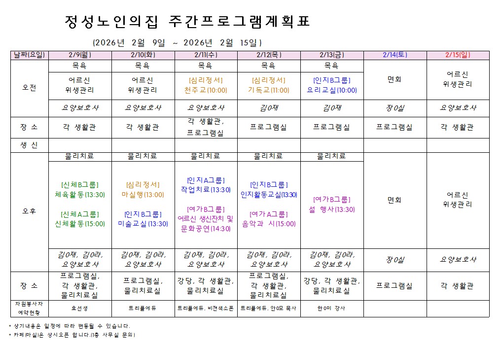 주간프로그램계획표(2026.2.9.~2.15.) 작성일 26-02-06 17:26 본문 . 목록 이전글주간프로그램계획표(2026.2.16.~2.22.) 26.02.13 다음글주간프로그램계획표(2026.2.2.~2.8.) 26.01.29