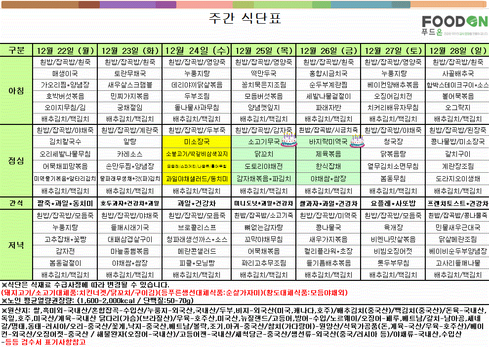 주간식단표(25.12.22.~12.28.) 작성일 25-12-22 16:40 본문 . 목록 이전글주간식단표(25.12.29.~26.01.04.) 26.01.02 다음글주간식단표(25.12.15.~12.21.) 25.12.18