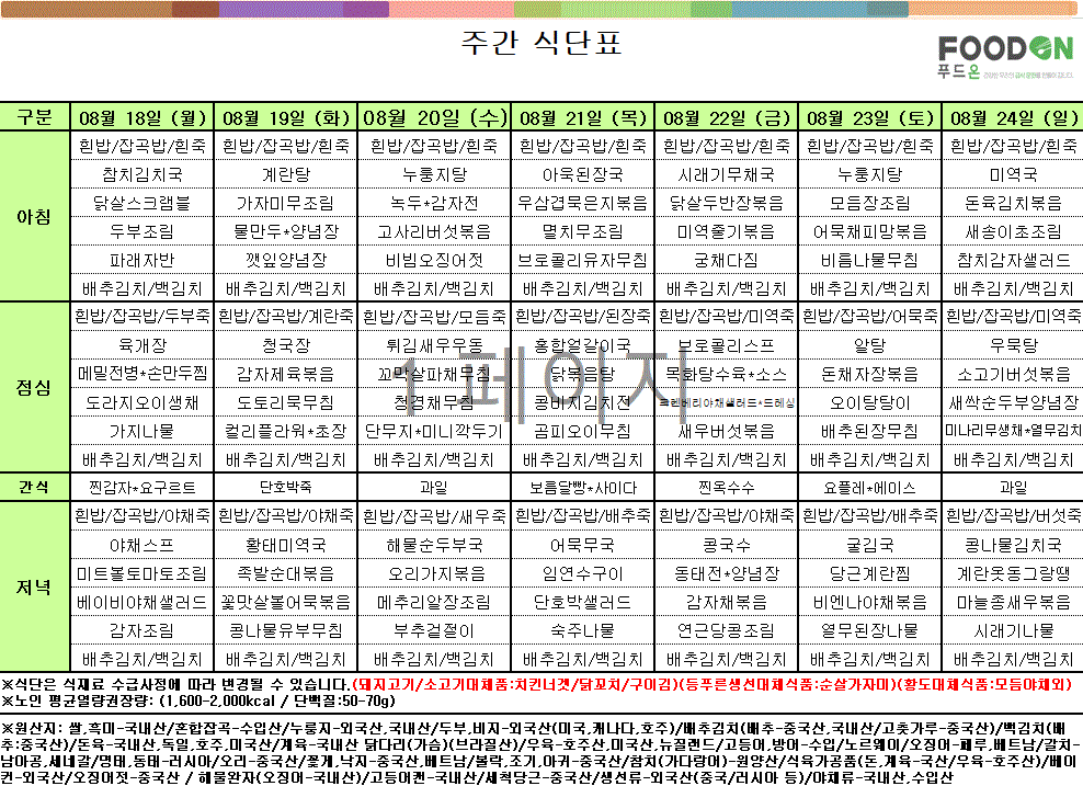 주간식단표(25.8.18.~8.24.) 작성일 25-08-18 13:55 본문 . 목록 이전글주간식단표(25.8.25.~8.31.) 25.08.25 다음글주간식단표(25.8.11.~8.17.) 25.08.11