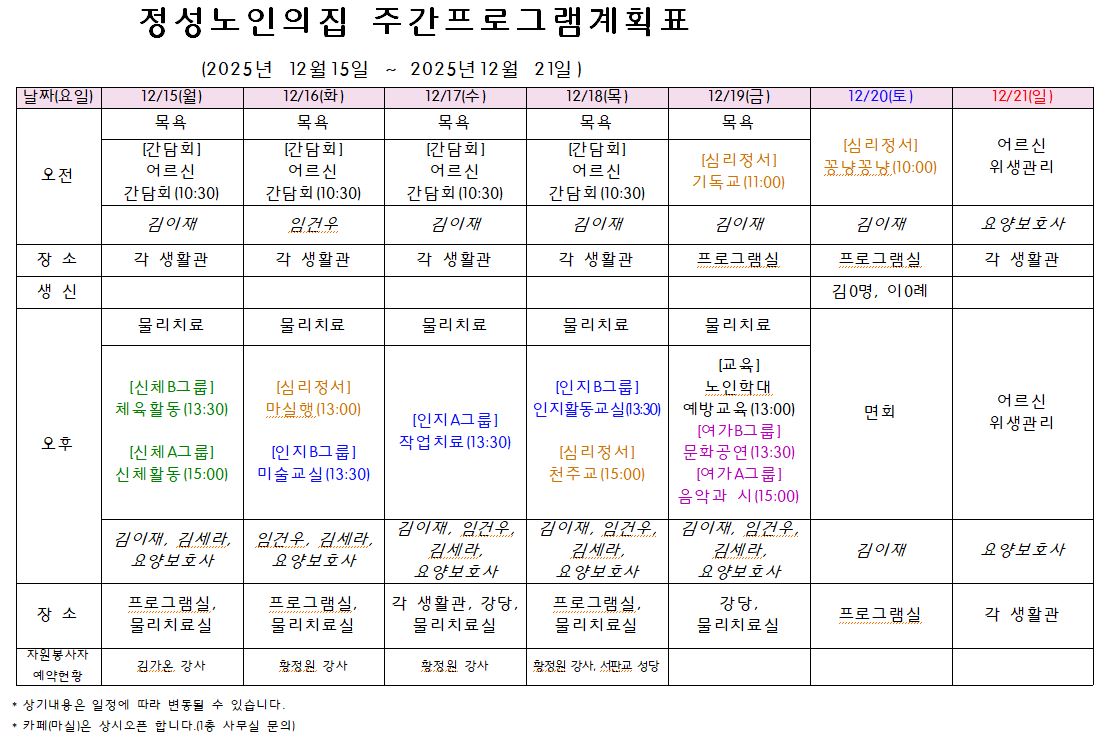 주간프로그램계획표(25.12.15.~12.21.) 작성일 25-12-12 17:58 본문 . 목록 이전글주간프로그램계획표(25.12.22.~12.28.) 25.12.19 다음글주간프로그램계획표(25.12.8.~12.14.) 25.12.05