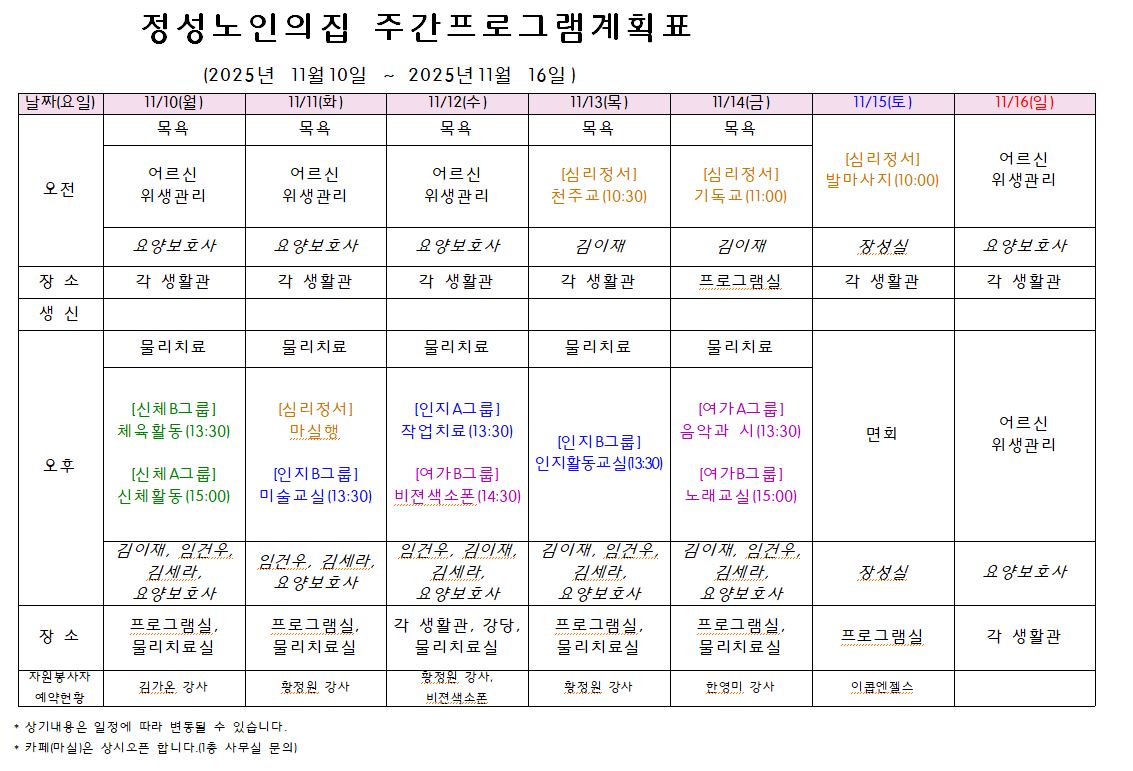 주간프로그램계획표(25.11.10.~11.16.) 작성일 25-11-07 11:19 본문 . 목록 이전글주간프로그램계획표(25.11.17.~11.23.) 25.11.14 다음글주간프로그램계획표(25.11.3.~11.9.) 25.10.31